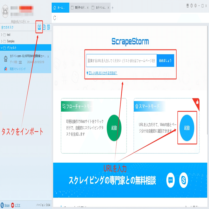 ScrapeStormのホムページ画面にスマートモードタスクを新規作成します。また、持っているタスクをインポートすることもできます。