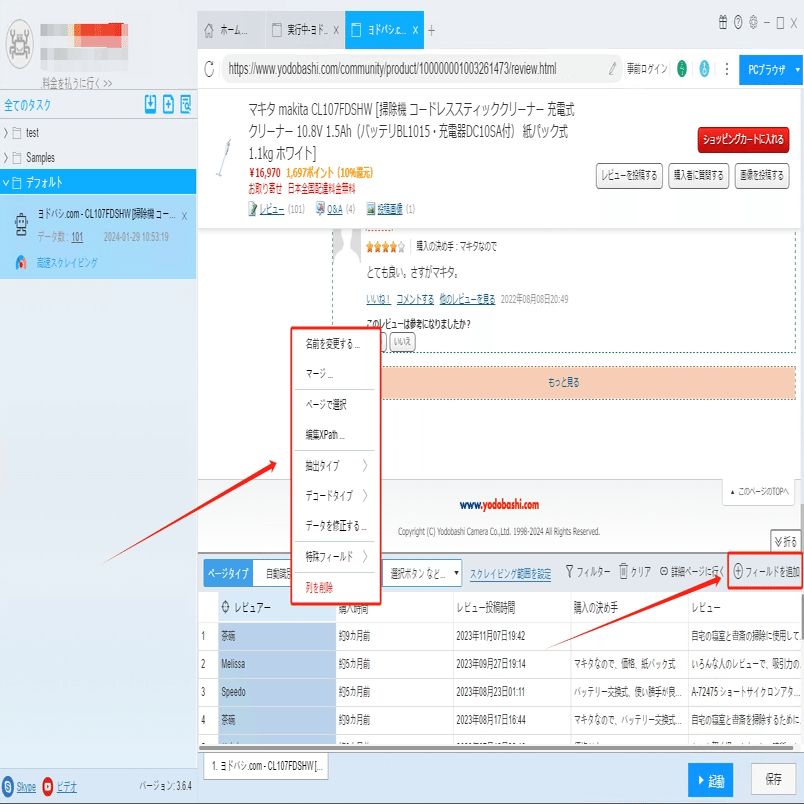 「フィールドを追加」ボタンをクリックして、画面に必要な要素を選択、データが自動的に抽出されます。また、必要に応じてフィールドの名前の変更または削除、結合できます。