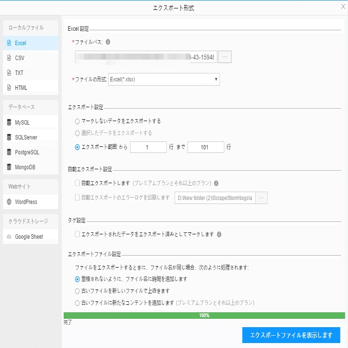ScrapeStormは、Excel、csv、html、txt、データベース、ローカルなどさまざまなエクスポート方法を提供します。抽出結果のエクスポート方法の詳細には下記のチュートリアルをご参照ください。