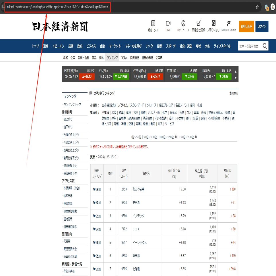 今回は株価の値上がりランキング1~100位の株価の情報を収得し、そのスクレイピング方法を紹介します。まず、URLをコピーしてください。