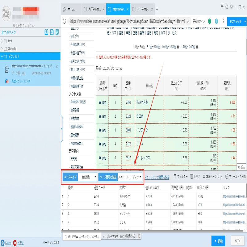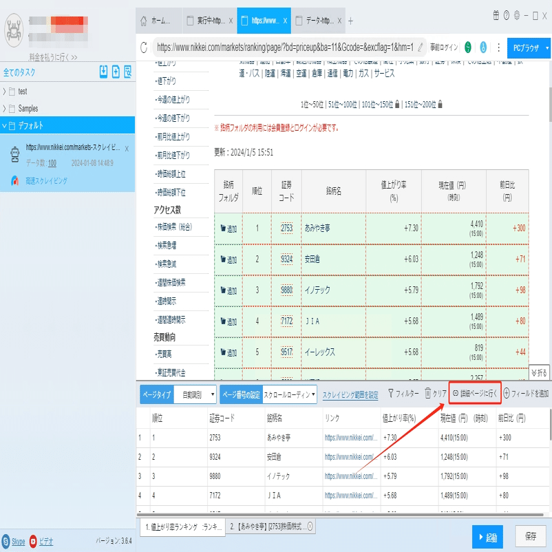 ソフトウェアの「詳細ページに行く」機能を利用し、始値、終値、高値などの情報を抽出します。