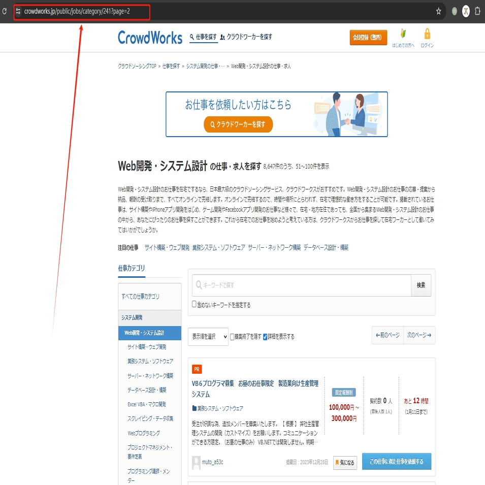今回はWeb開発・システム設計の仕事・求人を探すを例として、そのスクレイピング方法を紹介します。まず、URLをコピーしてください。
