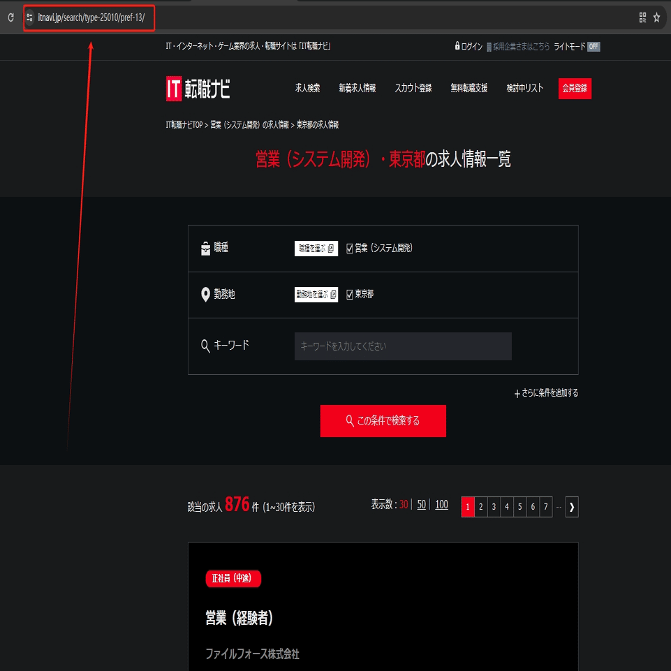 今回は営業(システム開発)・東京都の求人情報一覧ページを例として、そのスクレイピング方法を紹介します。まず、URLをコピーしてください。