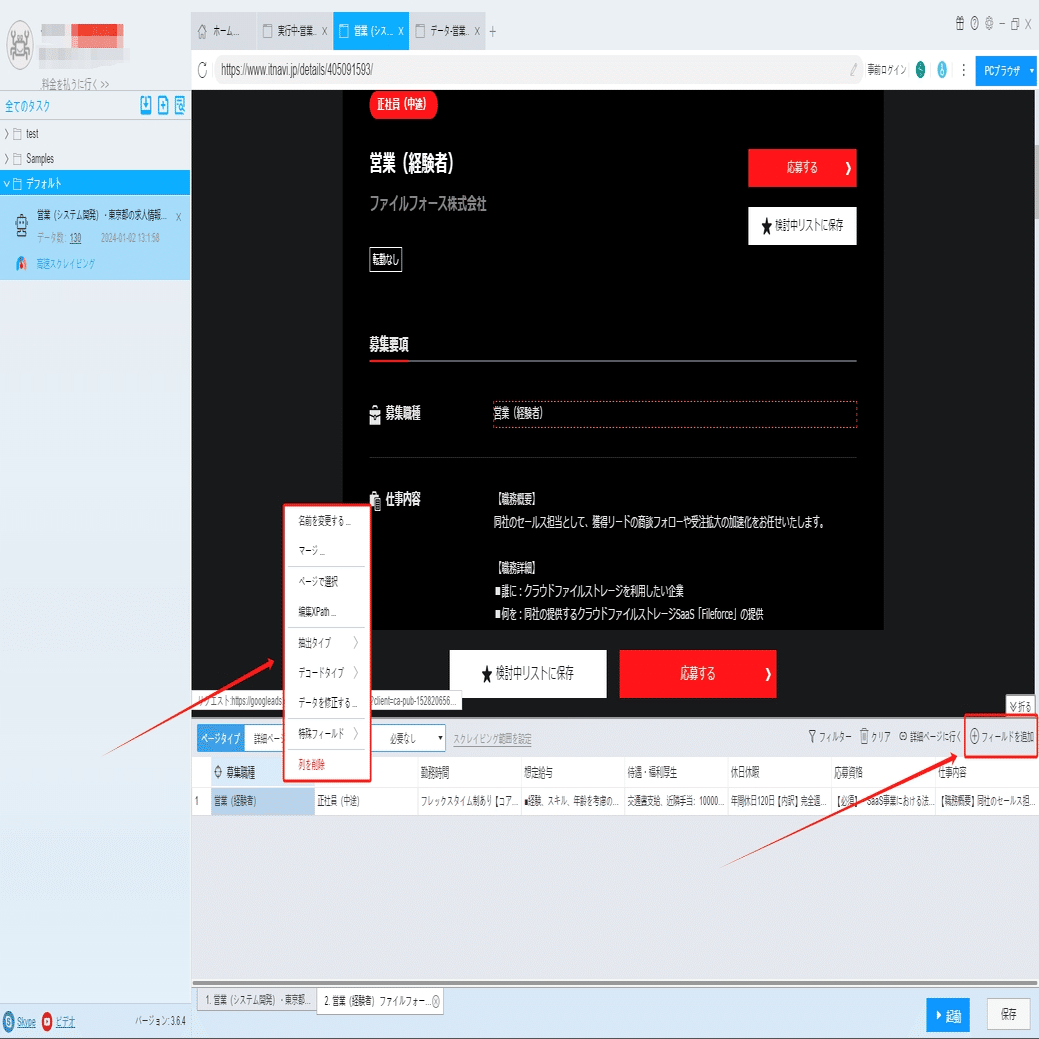 ソフトウェアの「詳細ページに行く」機能を利用し、応募資格、休日休暇、待遇福利厚生などの情報を抽出します。