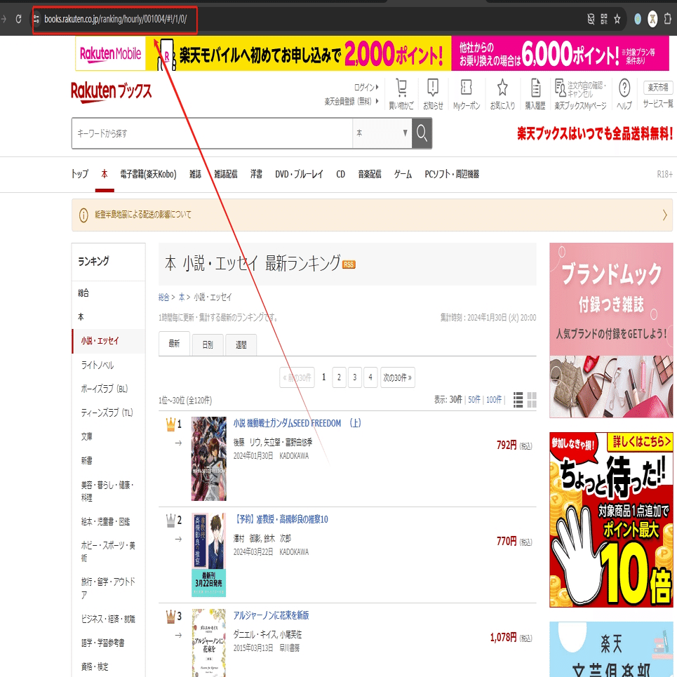 今回は本 小説・エッセイ 最新ランキング 小説・エッセイランキングページから書籍の情報を収得し、そのスクレイピング方法を紹介します。まず、URLをコピーしてください。