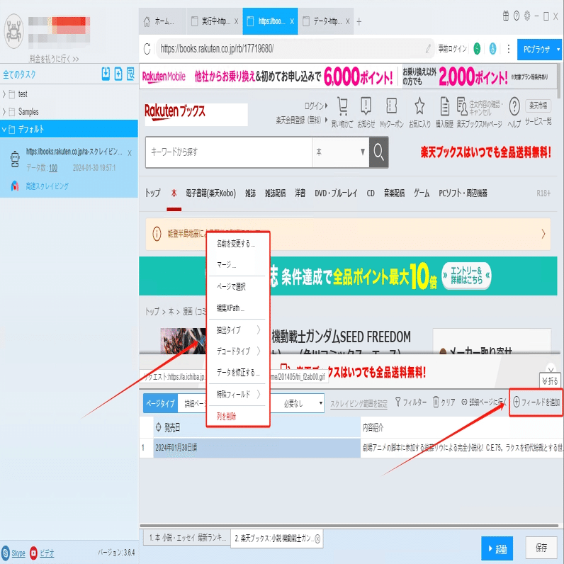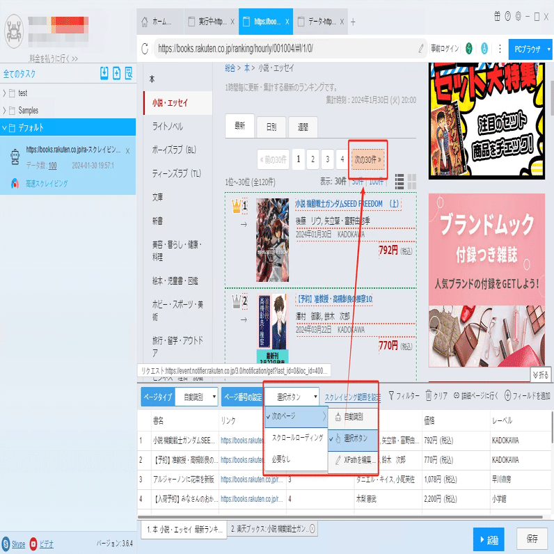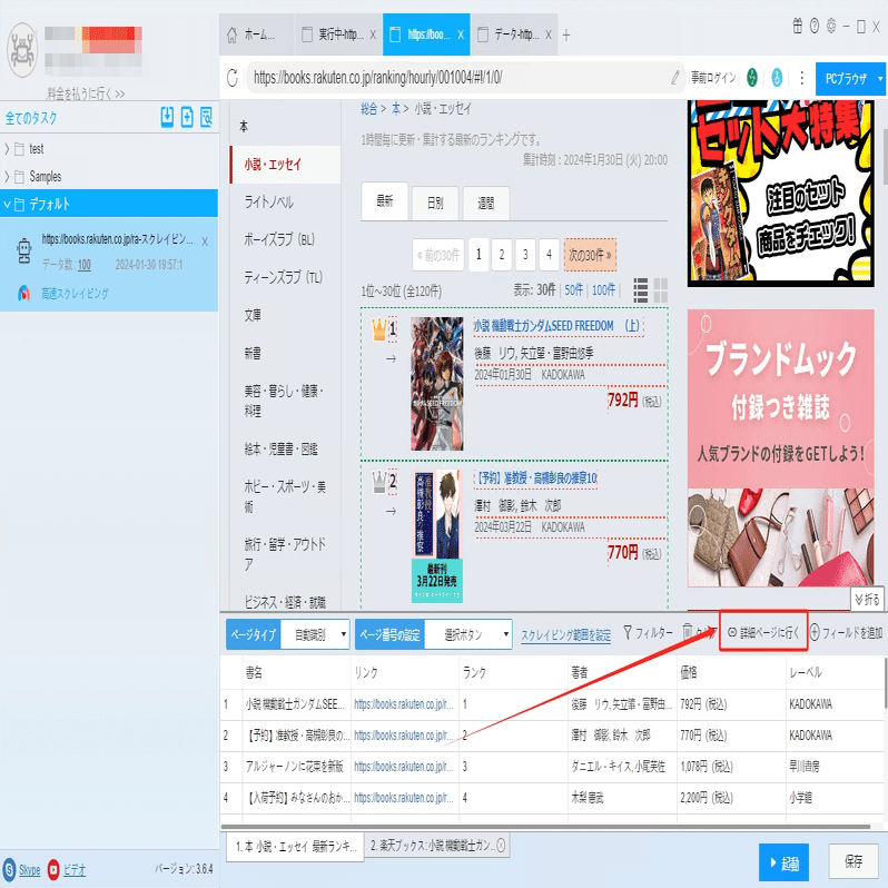 ソフトウェアの「詳細ページに行く」機能を利用し、発売日、小説の内容紹介などの情報を抽出します。