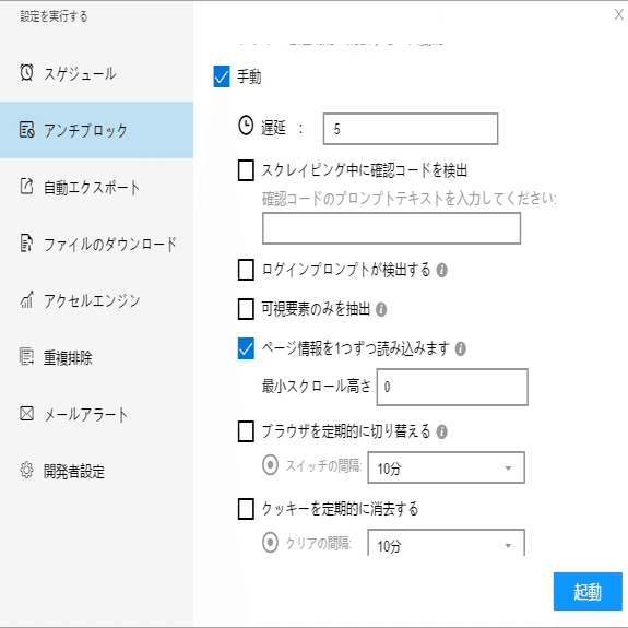 必要に応じて、スケジュール、アンチブロック、自動エクスポート、写真のダウンロード、スピードブーストを設定できます。サーバーに負荷しないように、遅延時間を設定してください。5秒以上を推薦します。スクレイピングタスクを配置する方法については、下記のチュートリアルをご参照ください。