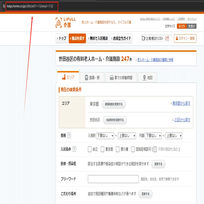 今回は世田谷区の有料老人ホーム・介護施設の検索結果一覧ページを例として、そのスクレイピング方法を紹介します。まず、URLをコピーしてください。