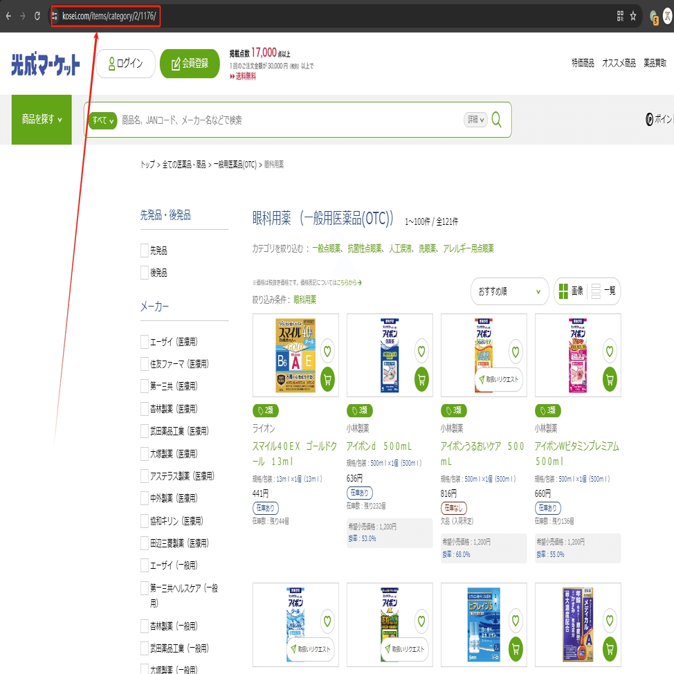 今回は眼科用薬 (一般用医薬品(OTC))の一覧ページを例として、そのスクレイピング方法を紹介します。まず、URLをコピーしてください。