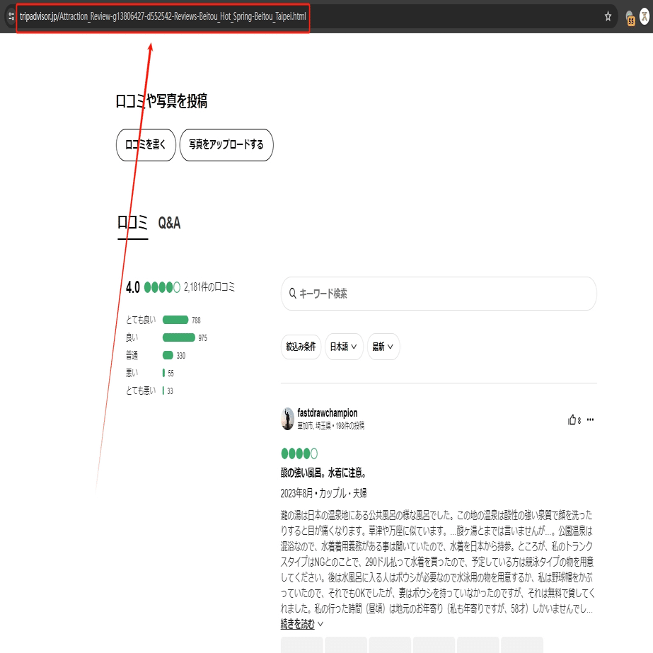 今回はある人気観光地のレビュー一覧ページを例として、そのスクレイピング方法を紹介します。まず、URLをコピーしてください。