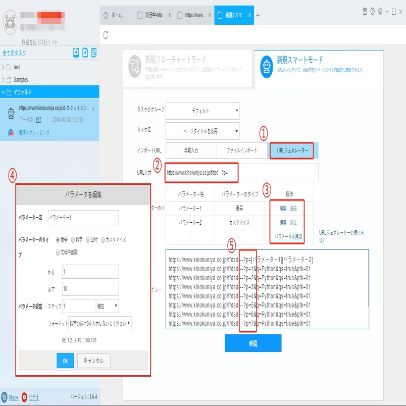 URLジェネレータでURLを入力して、パラメーターを追加画面にページ数を入力し、生成したURLはプレビュー画面でチェックしてください。
