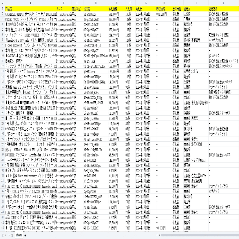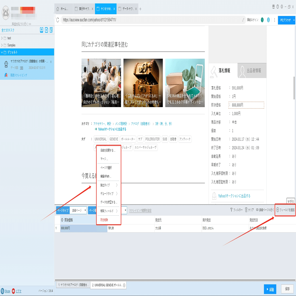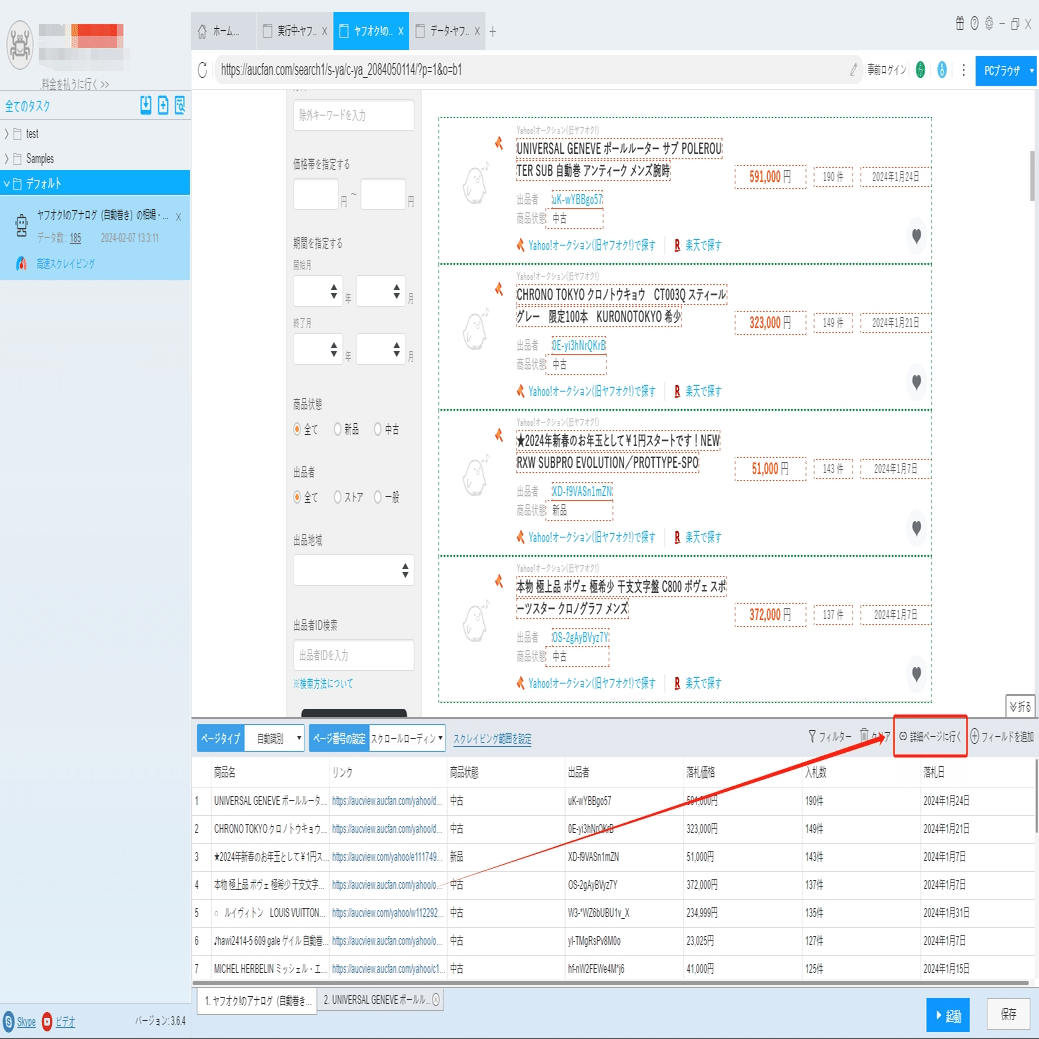ソフトウェアの「詳細ページに行く」機能を利用し、即決価格、送料負担、発送元などの情報を抽出します。