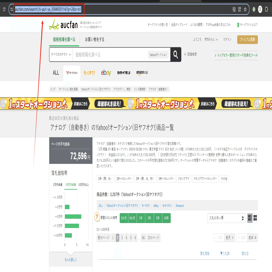 今回はアナログ(自動巻き)をキーワードとして、その検索結果ページから商品の情報を収得し、そのスクレイピング方法を紹介します。まず、第二ページのリンクをコピーしてください。