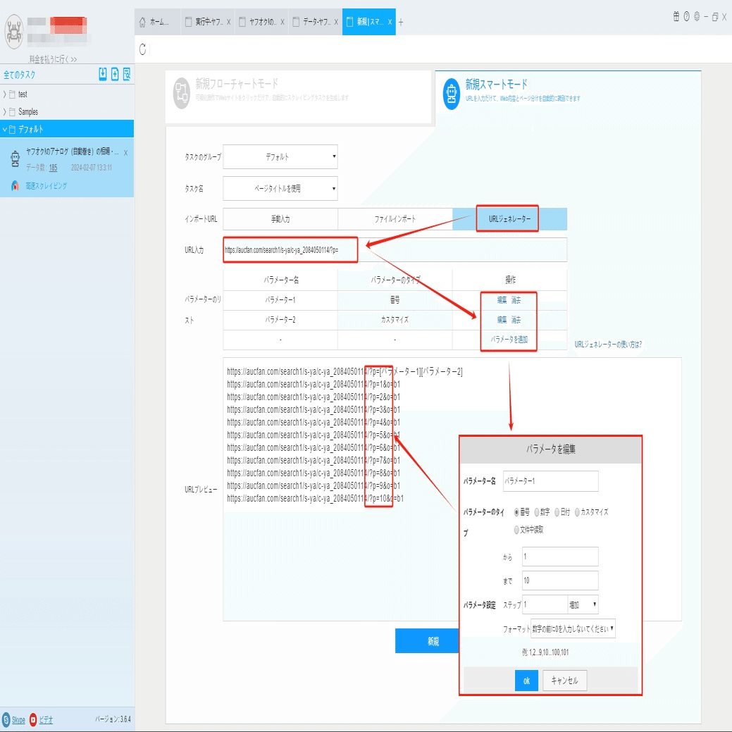 URLジェネレータでURLを入力して、パラメーターを追加画面にページ数を入力し、生成したURLはプレビュー画面でチェックしてください。