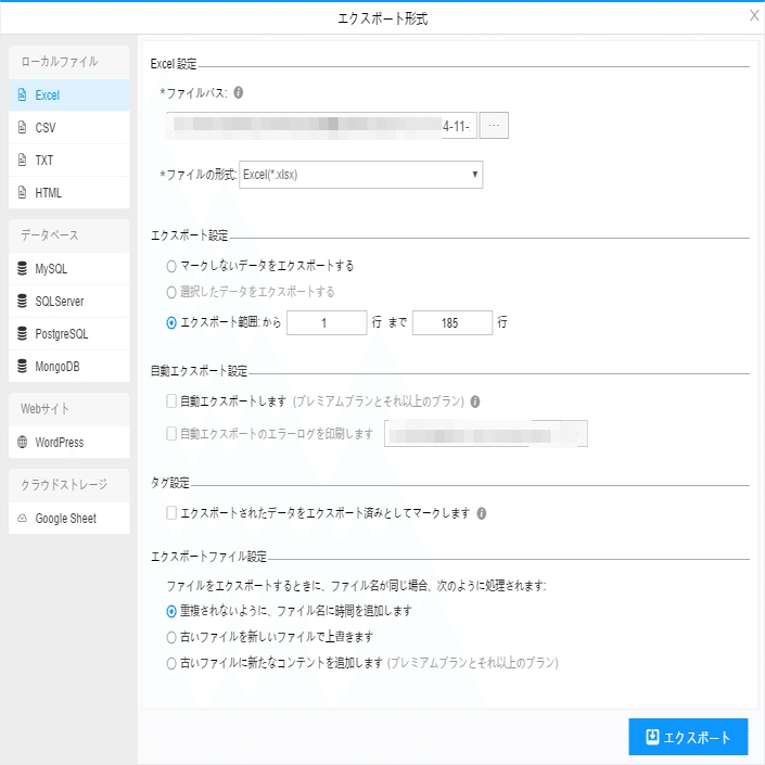 ScrapeStormは、Excel、csv、html、txt、データベース、ローカルなどさまざまなエクスポート方法を提供します。抽出結果のエクスポート方法の詳細には下記のチュートリアルをご参照ください。