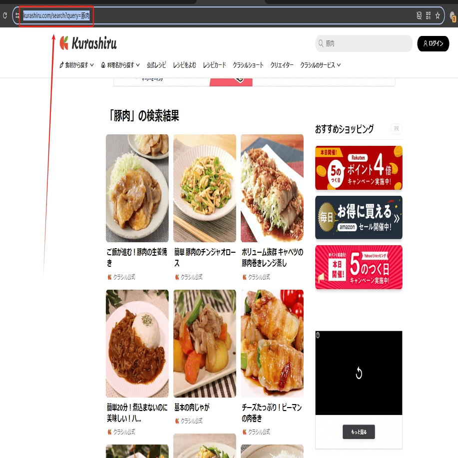 今回は豚肉をキーワードとして、検索結果ページからレシピの情報を収得し、そのスクレイピング方法を紹介します。まず、URLをコピーしてください。