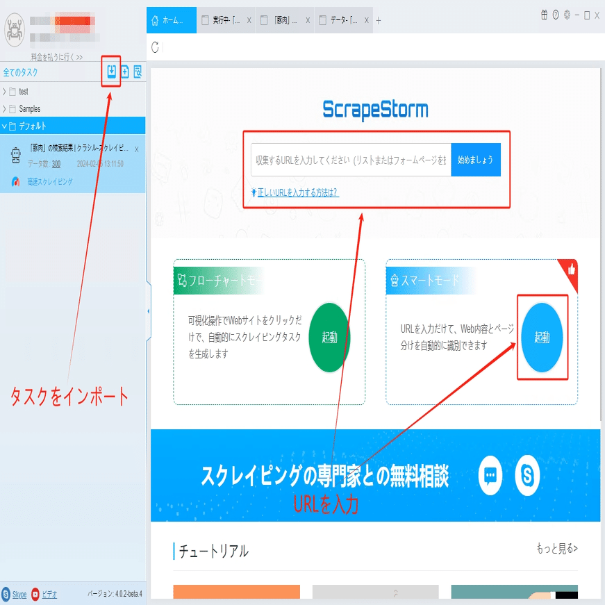 ScrapeStormのホムページ画面にスマートモードタスクを新規作成します。また、持っているタスクをインポートすることもできます。