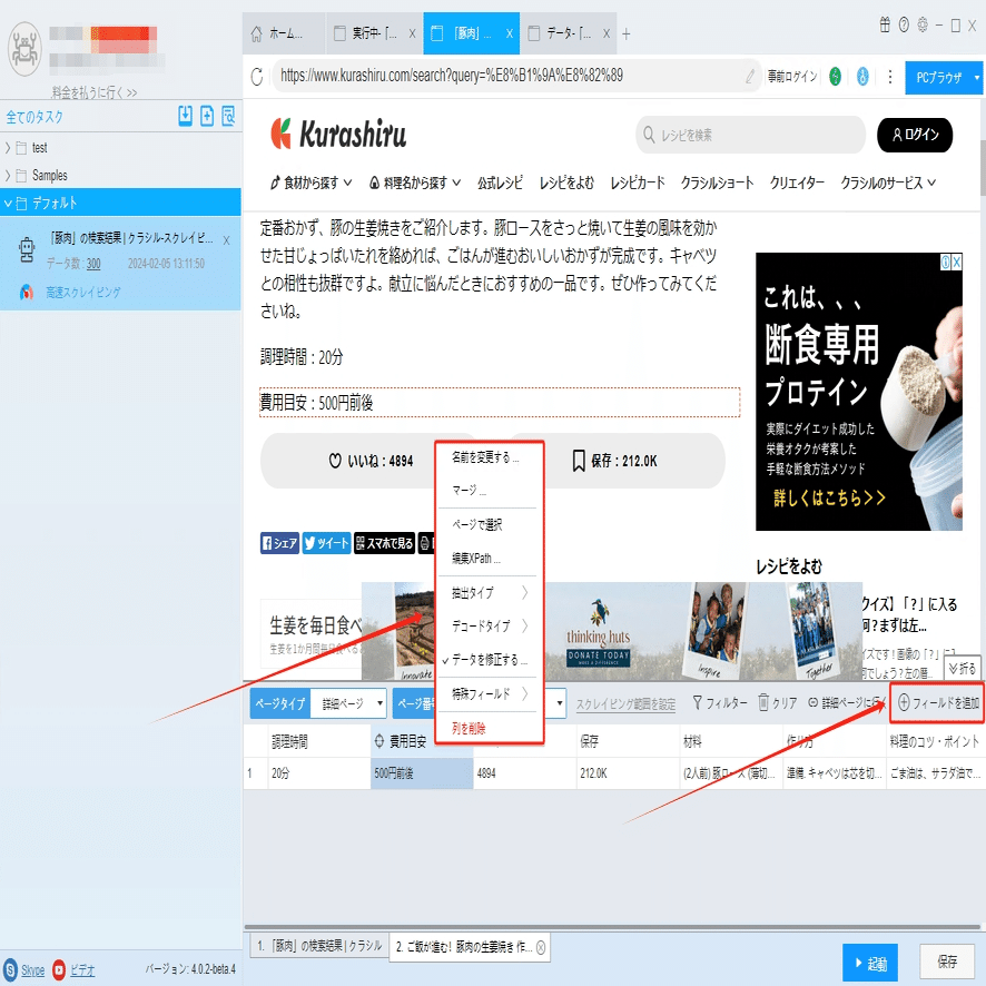 ソフトウェアの「詳細ページに行く」機能を利用し、調理時間、費用目安、作り方などの情報を抽出します。