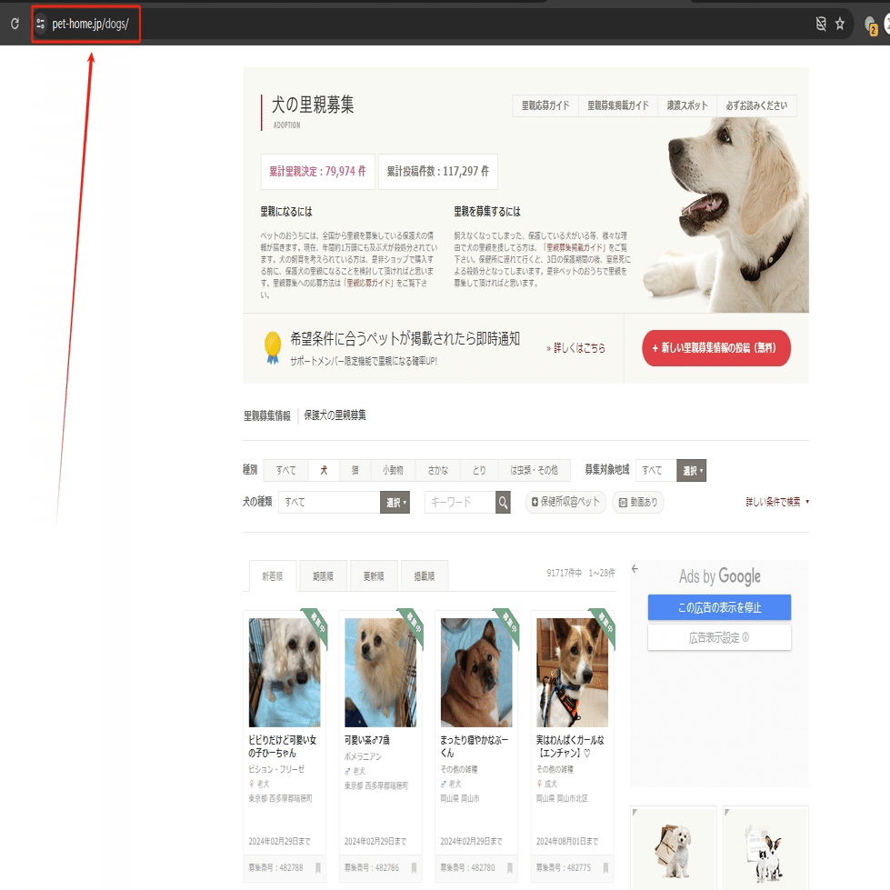 今回は犬の里親募集ページから犬の情報を収得し、そのスクレイピング方法を紹介します。まず、URLをコピーしてください。