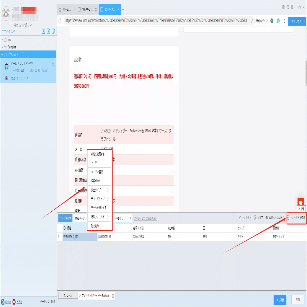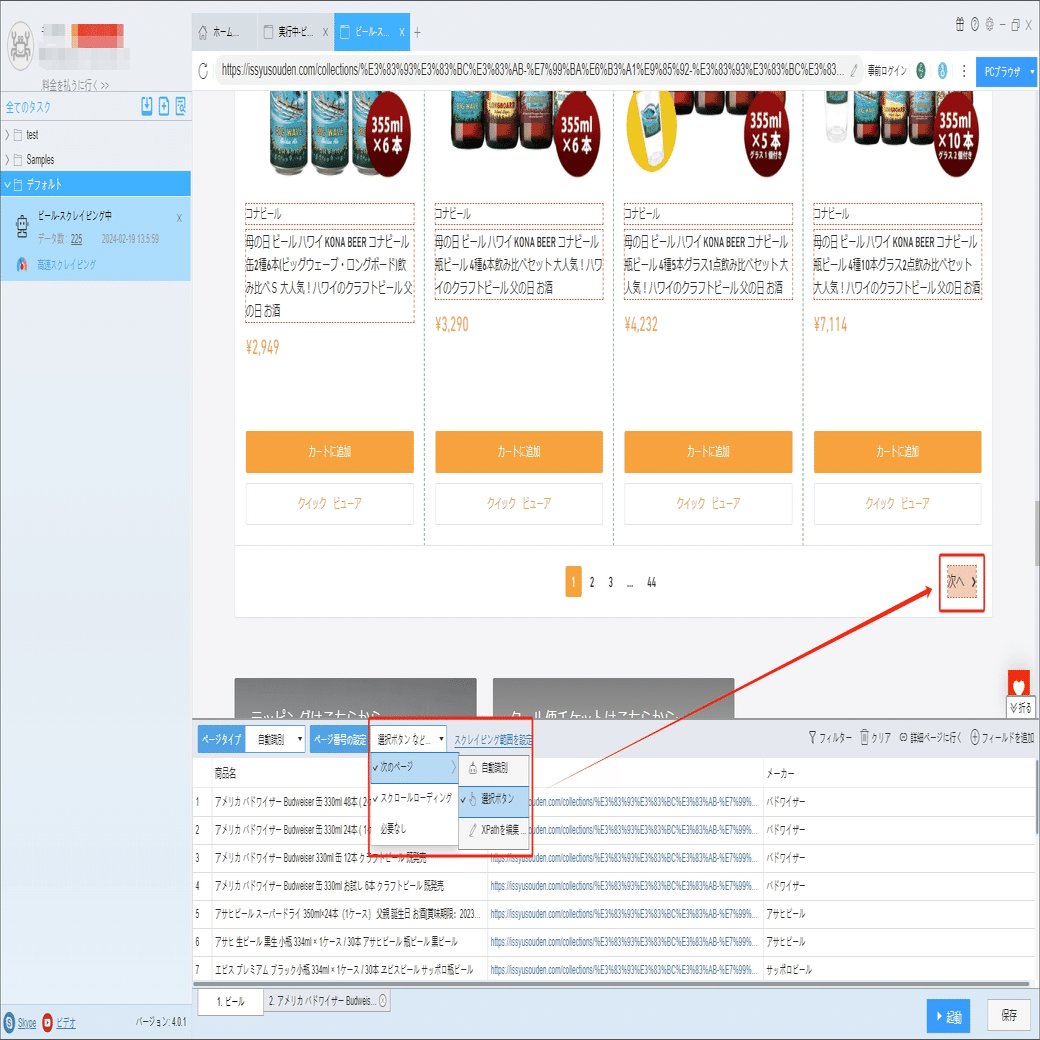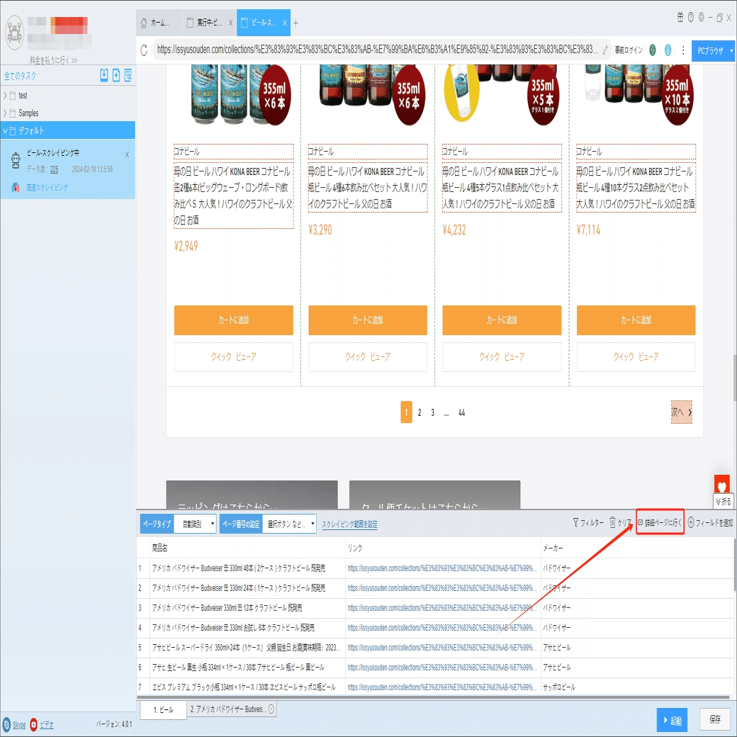 ソフトウェアの「詳細ページに行く」機能を利用し、容量/入数、Alc度数、国(産地 AOP)などの情報を抽出します。