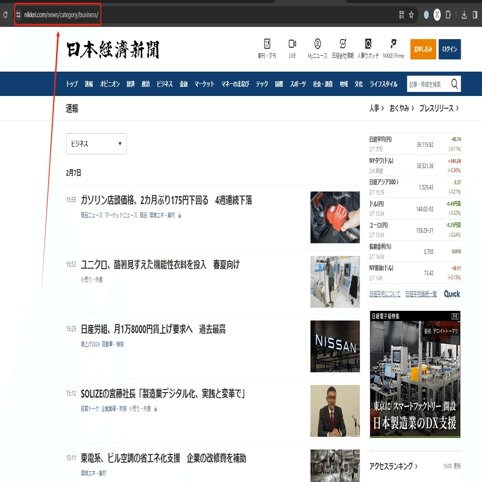 今回はビジネス速報一覧ページから速報を収得し、そのスクレイピング方法を紹介します。まず、URLをコピーしてください。