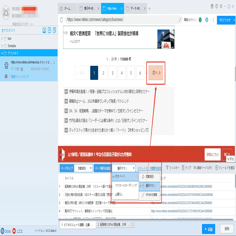ScrapeStormは自動的にリスト要素とページボタンを識別できます。偶に誤差があれば、手動で選択してください。下記のチュートリアルも参照してください。