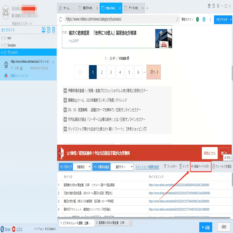 ソフトウェアの「詳細ページに行く」機能を利用し、関連企業、業界、速報内容などの情報を抽出します。
