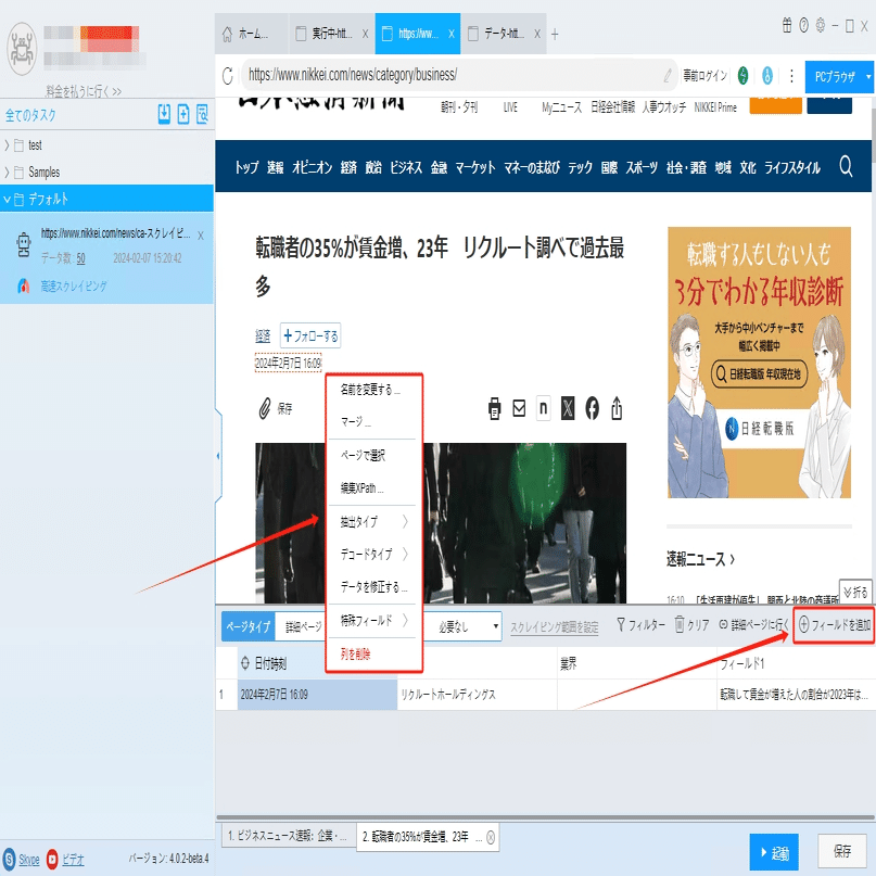 「フィールドを追加」ボタンをクリックして、画面に必要な要素を選択、データが自動的に抽出されます。また、必要に応じてフィールドの名前の変更または削除、結合できます。