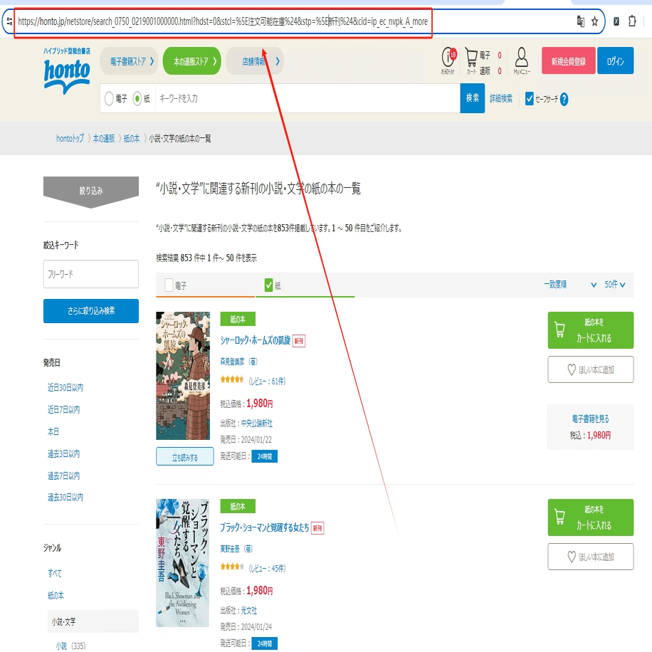 今回は“小説・文学”に関連する新刊の小説・文学の紙の本の一覧ページから書籍の情報を収得し、そのスクレイピング方法を紹介します。まず、URLをコピーしてください。