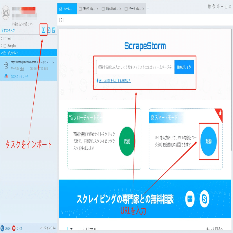 ScrapeStormのホムページ画面にスマートモードタスクを新規作成します。また、持っているタスクをインポートすることもできます。