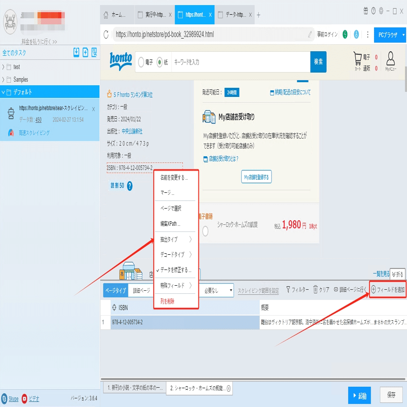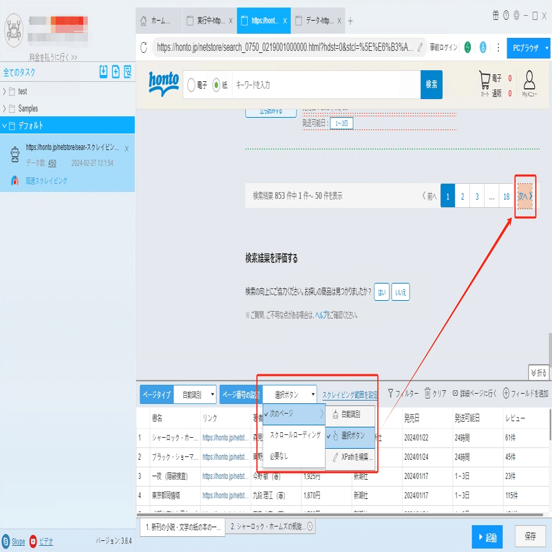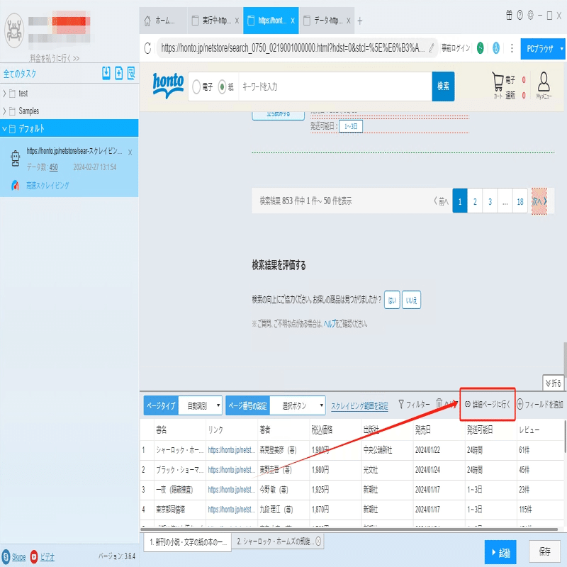 ソフトウェアの「詳細ページに行く」機能を利用し、ISBN、書籍の概要などの情報を抽出します。