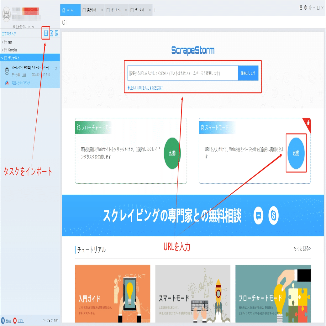 ScrapeStormのホムページ画面にスマートモードタスクを新規作成します。また、持っているタスクをインポートすることもできます。
