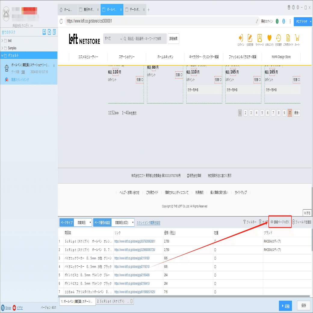 ソフトウェアの「詳細ページに行く」機能を利用し、商品コード、メーカー、素材・原材料などの情報を抽出します。