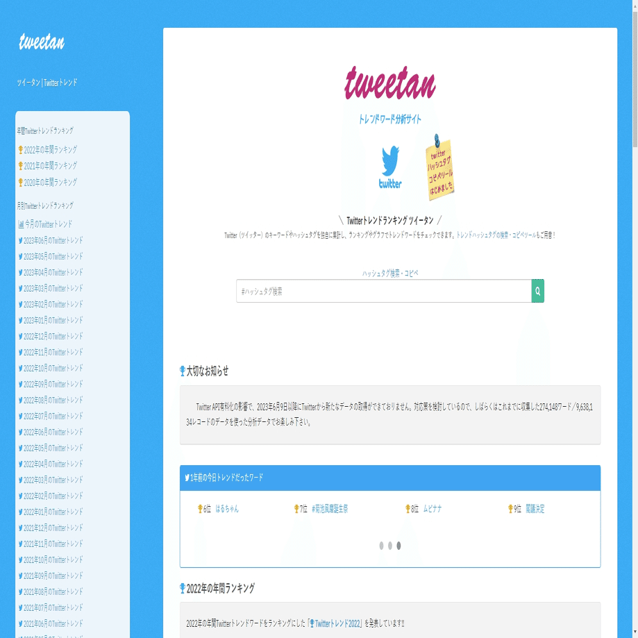 ツイータンは、Twitter(ツイッター)のトレンドランキングをリアルタイムで表示するウェブサイトです。トレンドや話題に関連するツイートを閲覧することができます。ユーザーは気になるトピックに関するツイートを読んだり、他のユーザーの意見や反応を知ることができます。