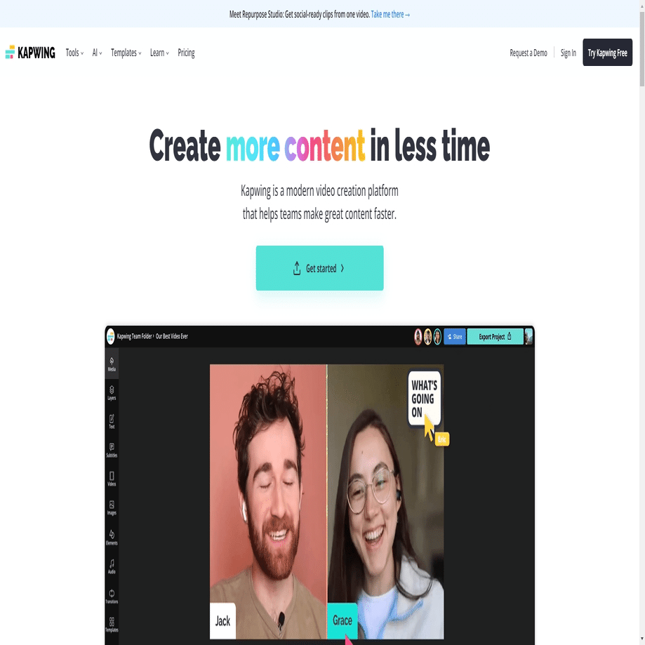 Kapwing(カプウィング)は、オンラインで使える動画編集ツールおよびクリエイティブプラットフォームです。ビデオ、画像、GIFなどのメディアコンテンツを編集し、カスタマイズするためのさまざまな機能を提供しています。使いやすいインターフェースと直感的な操作方法を提供しています。ユーザーは、専門知識や経験がなくても、簡単に動画や画像を編集できます。