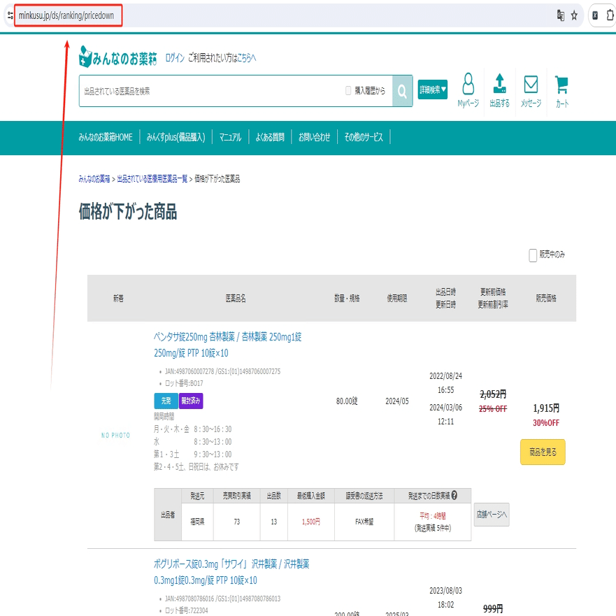 今回はみんくすの価格が下がった商品一覧ページを例として、そのスクレイピング方法を紹介します。まず、URLをコピーしてください。