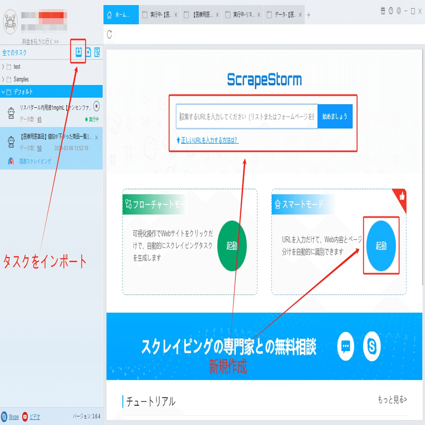 ScrapeStormのホムページ画面にスマートモードタスクを新規作成します。また、持っているタスクをインポートすることもできます。