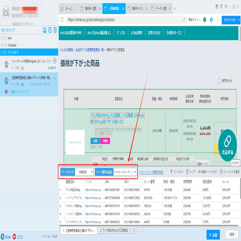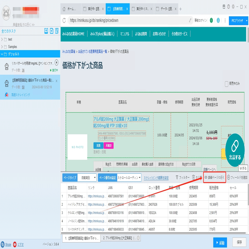ソフトウェアの「詳細ページに行く」機能を利用し、数量、規格、使用期限などの情報を抽出します。