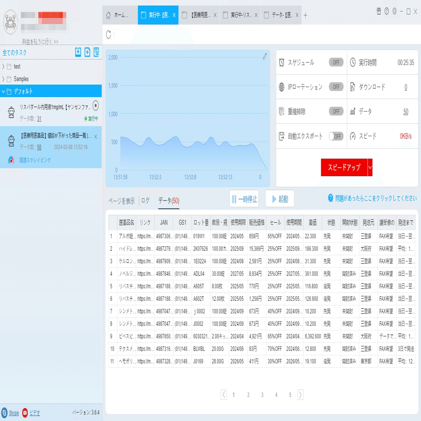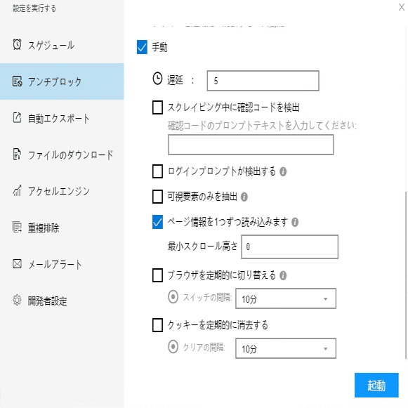 必要に応じて、スケジュール、アンチブロック、自動エクスポート、写真のダウンロード、スピードブーストを設定できます。サーバーに負荷しないように、遅延時間を設定してください。5秒以上を推薦します。スクレイピングタスクを配置する方法については、下記のチュートリアルをご参照ください。