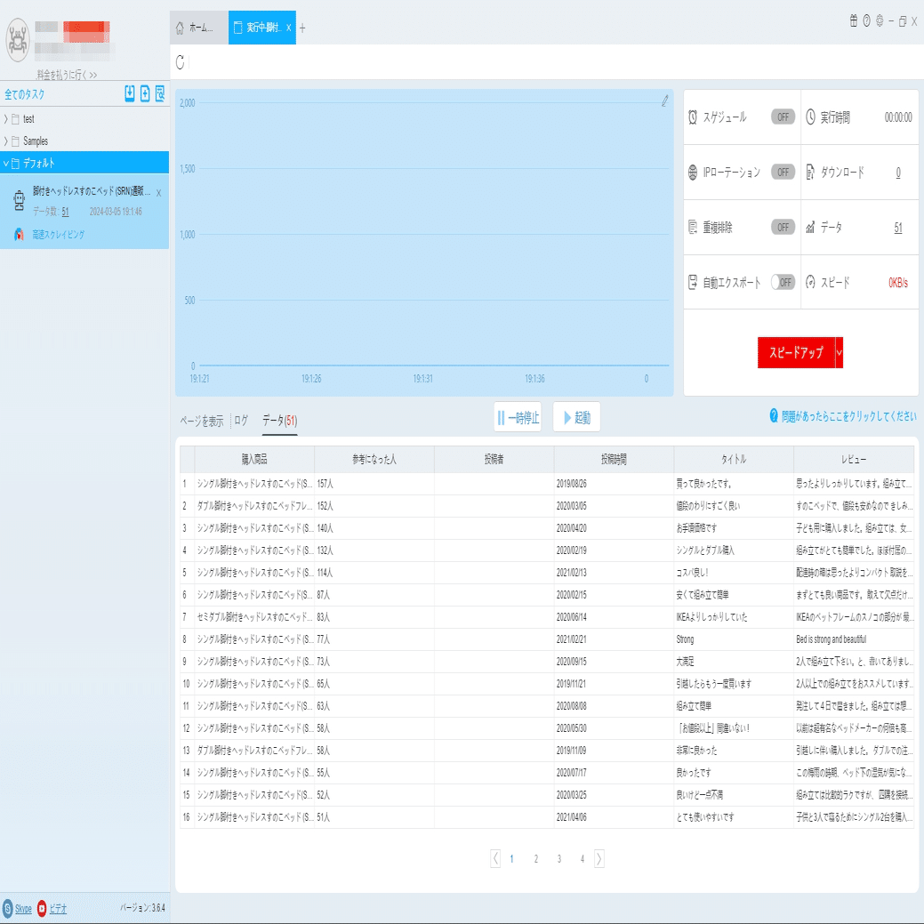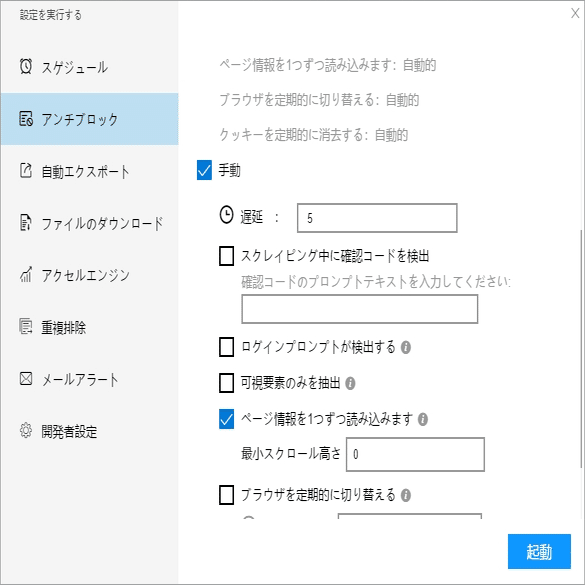 必要に応じて、スケジュール、アンチブロック、自動エクスポート、写真のダウンロード、スピードブーストを設定できます。サーバーに負荷しないように、遅延時間を設定してください。5秒以上を推薦します。スクレイピングタスクを配置する方法については、下記のチュートリアルをご参照ください。