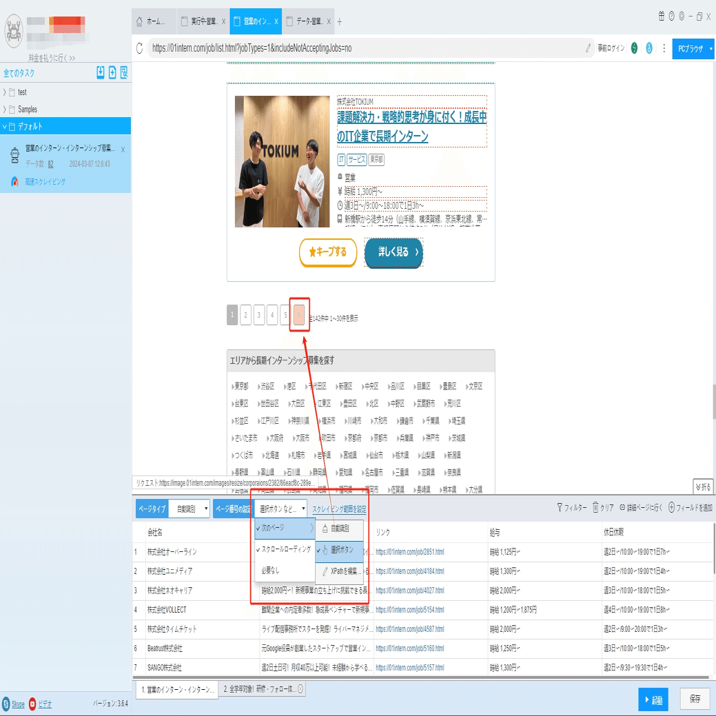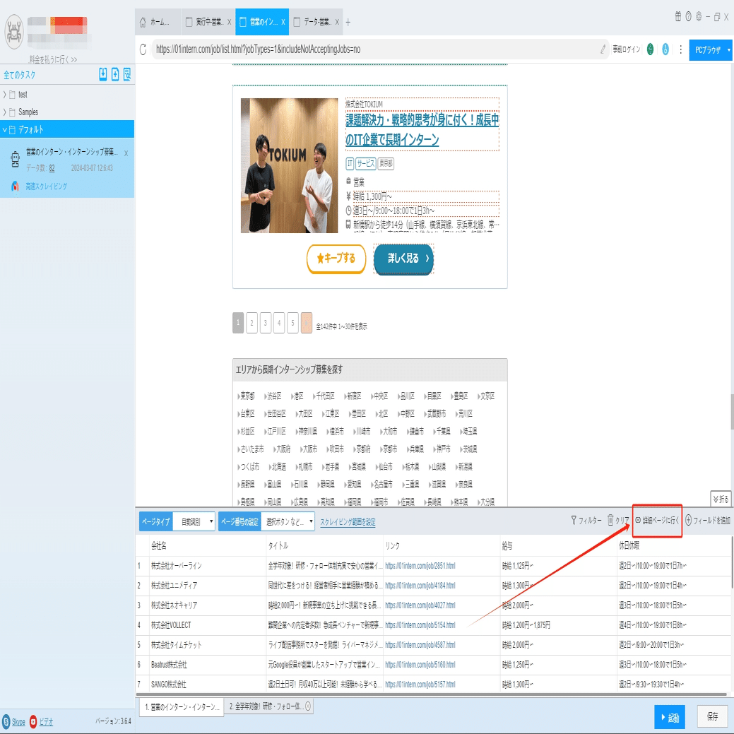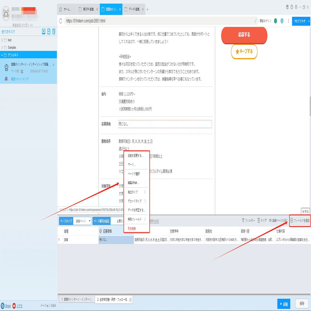 ソフトウェアの「詳細ページに行く」機能を利用し、応募資格、勤務条件、対象学年などの情報を抽出します。