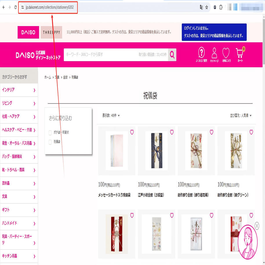 今回は祝儀袋の検索結果一覧ページから商品の情報を収得し、そのスクレイピング方法を紹介します。まず、URLをコピーしてください。