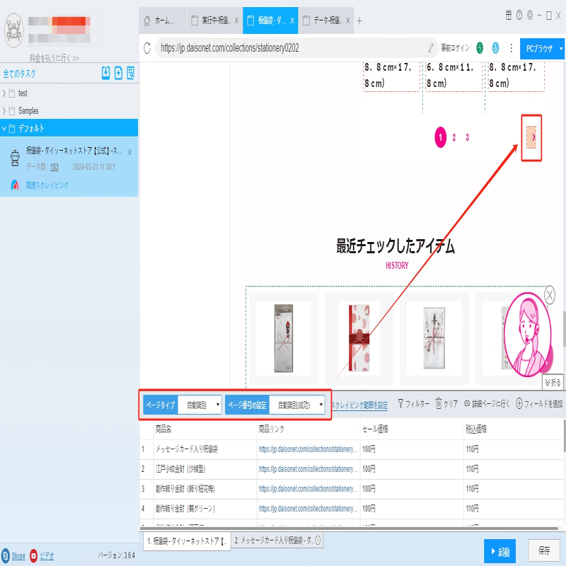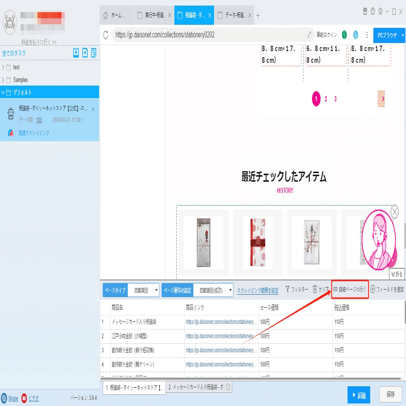 ソフトウェアの「詳細ページに行く」機能を利用し、原産国、材質、商品サイズなどの情報を抽出します。