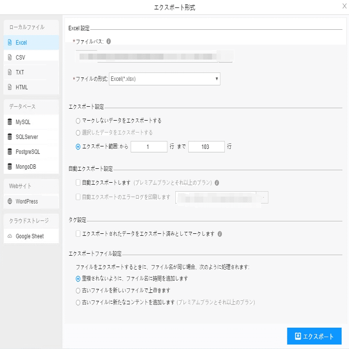 ScrapeStormは、Excel、csv、html、txt、データベース、ローカルなどさまざまなエクスポート方法を提供します。抽出結果のエクスポート方法の詳細には下記のチュートリアルをご参照ください。