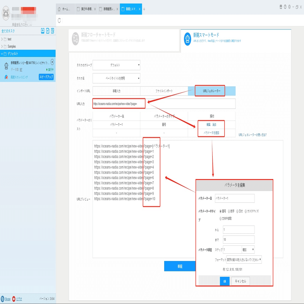 URLジェネレータでURLを入力して、パラメーターを追加画面にページ数を入力し、生成したURLはプレビュー画面でチェックしてください。