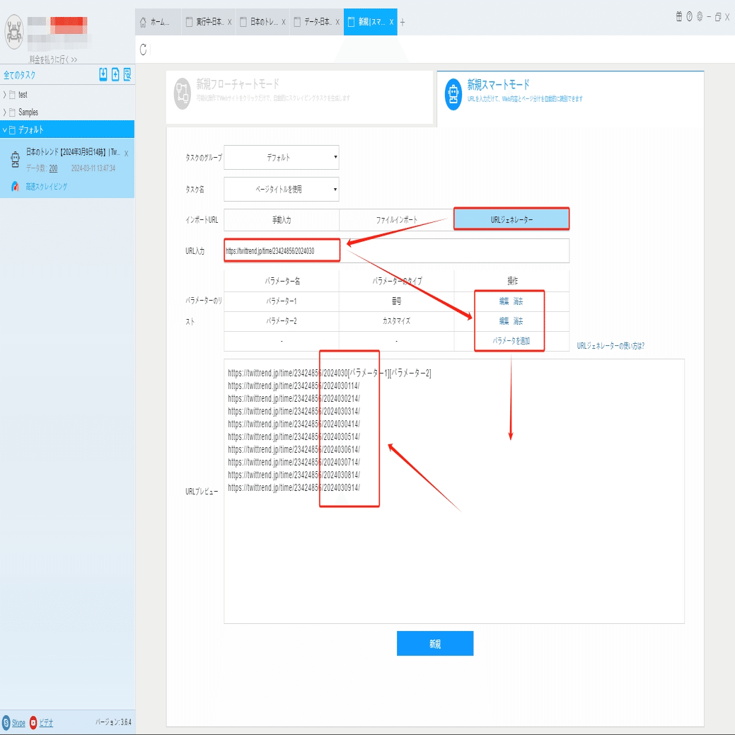 URLジェネレータでURLを入力して、パラメーターを追加画面にページ数を入力し、生成したURLはプレビュー画面でチェックしてください。