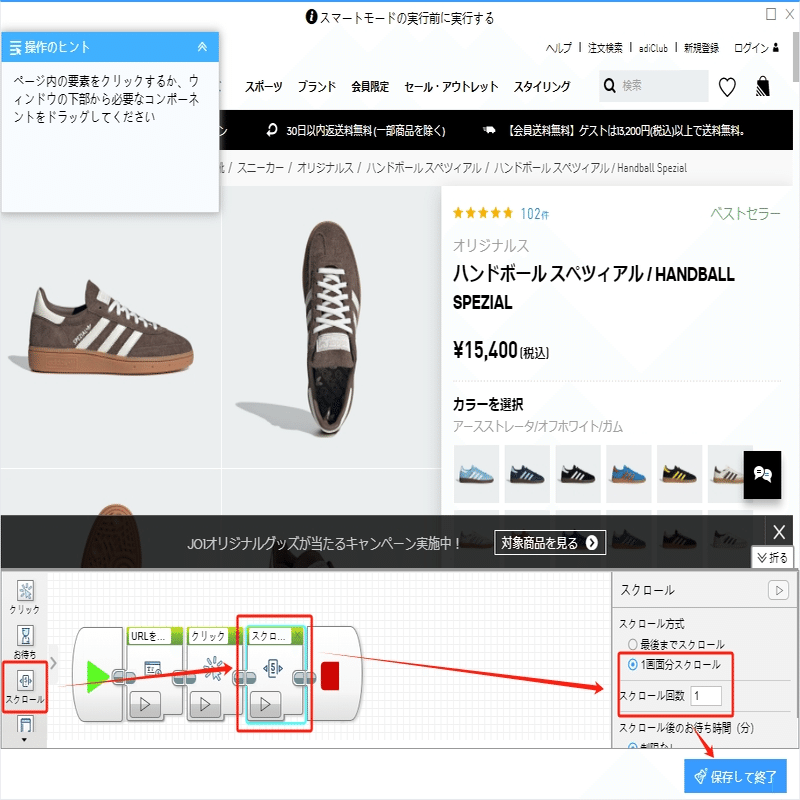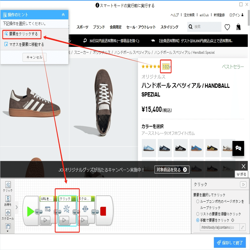 ①レビュー件数をクリックし、操作ヒントに「要素をクリック」を選んでください。