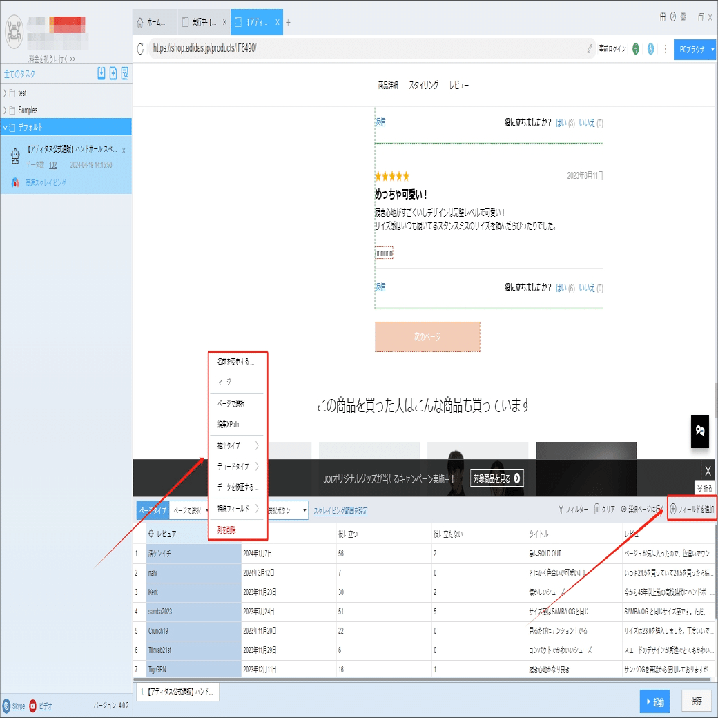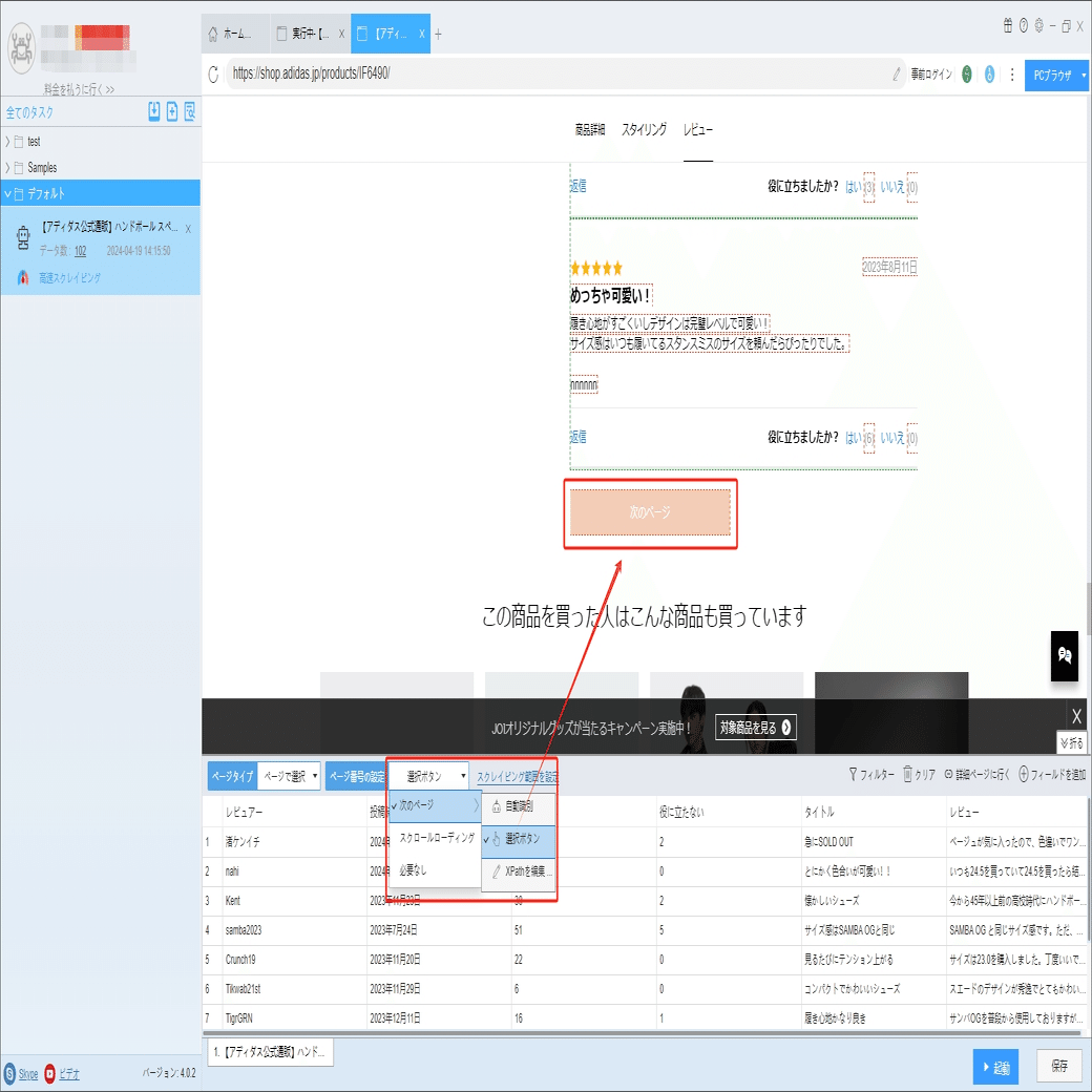 ネット通販!Adidasスニーカーの商品のレビューをスクレイピング