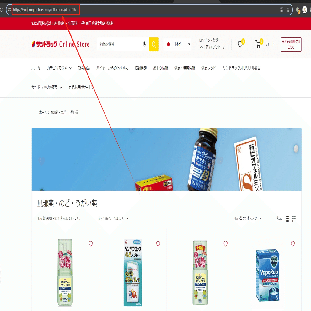 今回は風邪薬を検索条件として、その検索結果一覧ページのスクレイピング方法を紹介します。まず、URLをコピーしてください。