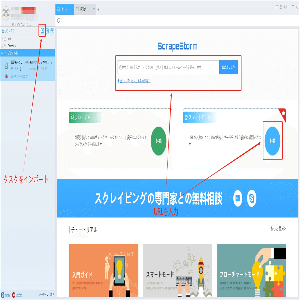 ScrapeStormのホムページ画面にスマートモードタスクを新規作成します。また、持っているタスクをインポートすることもできます。